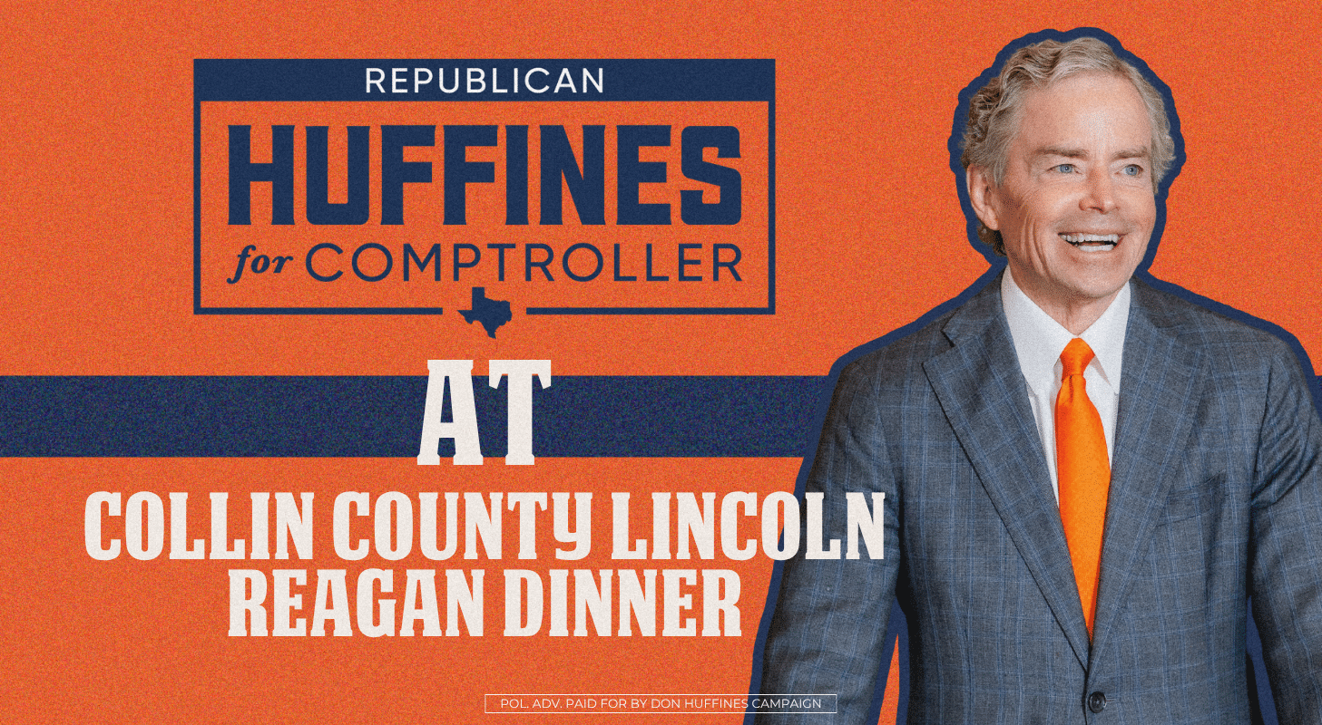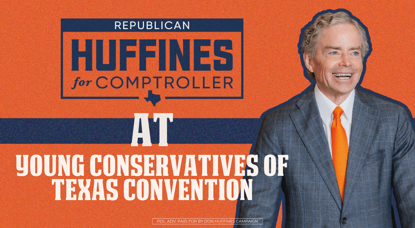NEWS Huffines Live Conversation – Texas Tribune Read More Last Week in Texas Read More The “C” Club Endorses Don Huffines for Texas Comptroller Read More Happy Easter! Read More Texas Means Business Read More Texas Department of Public Safety Officers Association PAC Endorse Don Huffines for Texas Comptroller Read More My Trip to the White House Read More Texas College Republicans Endorse Don Huffines for Texas Comptroller Read More Texas Values Action Endorses Don Huffines for Texas Comptroller Read More Huffines on Capital Tonight – Spectrum News Read More Onward to Victory! Read More Huffines on Eye on Politics with Jack Fink – CBS News Texas Read More Huffines on Inside Texas Politics Read More Huffines on Amy Robbins Show Read More Huffines Declares Victory Read More President Trump Endorses Don Huffines for Texas Comptroller Read More DOGE Texas Tour: Guadalupe County Meet and Greet Read More DOGE Texas Tour: San Antonio Young Republicans Read More DOGE Texas Tour: Harris County Lincoln Reagan Dinner Read More DOGE Texas Tour: Young Conservatives of Texas Convention Read More DOGE Texas Tour: Collin County Lincoln Reagan Dinner Read More DOGE Texas Tour: Bowie County Republican Party PAC Read More DOGE Texas Tour: Harrison County Lincoln Reagan Dinner Read More DOGE Texas Tour: Jefferson County Monthly Mixer Read More DOGE Texas Tour: Frisco Lakes Candidate Forum Read More DOGE Texas Tour: Lamar County Republican Women Read More DOGE Texas Tour: Hood County Lincoln Reagan Dinner Read More Congressman Lance Gooden Endorses Don Huffines for Texas Comptroller Read More DOGE Texas Tour: True Texas Project Summit Read More DOGE Texas Tour: Brazoria County Republican Party Valentine's Dinner Read More 1 2 3 … 9 Next Entries TEXAS FIRST As your Texas Comptroller, I will DOGE our government to improve efficiency and root out waste and fraud. I’ll fight to return the savings to Texas taxpayers.
